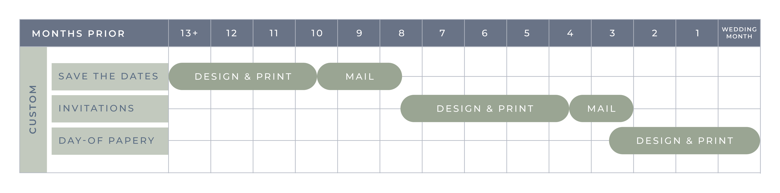 Please note that custom invitations take between 8-12 weeks to design & print. Your starting date will be scheduled based off of your ideal mailing date and our current design calendar availability. Please fill out the custom invitations contact form below to get started.